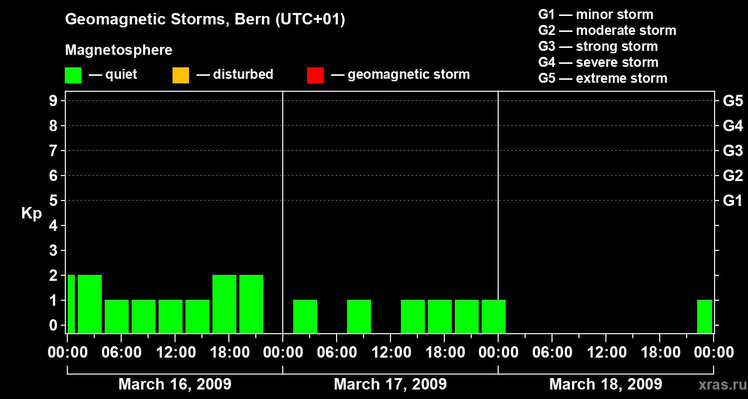 Changes in the geomagnetic index Kp from March 16 to 18, 2009 for mid latitudes