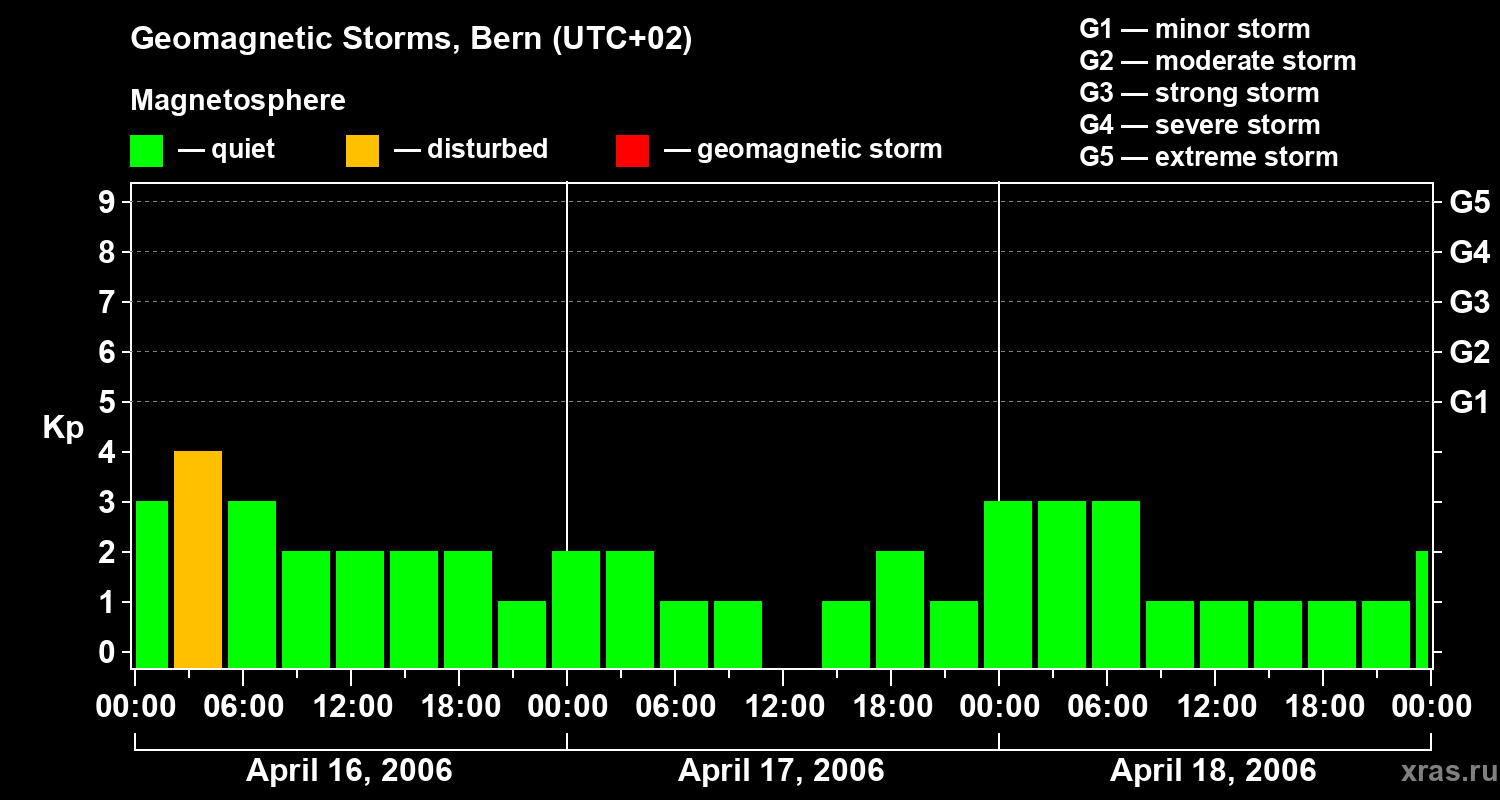 Changes in the geomagnetic index Kp from April 16 to 18, 2006 for mid latitudes