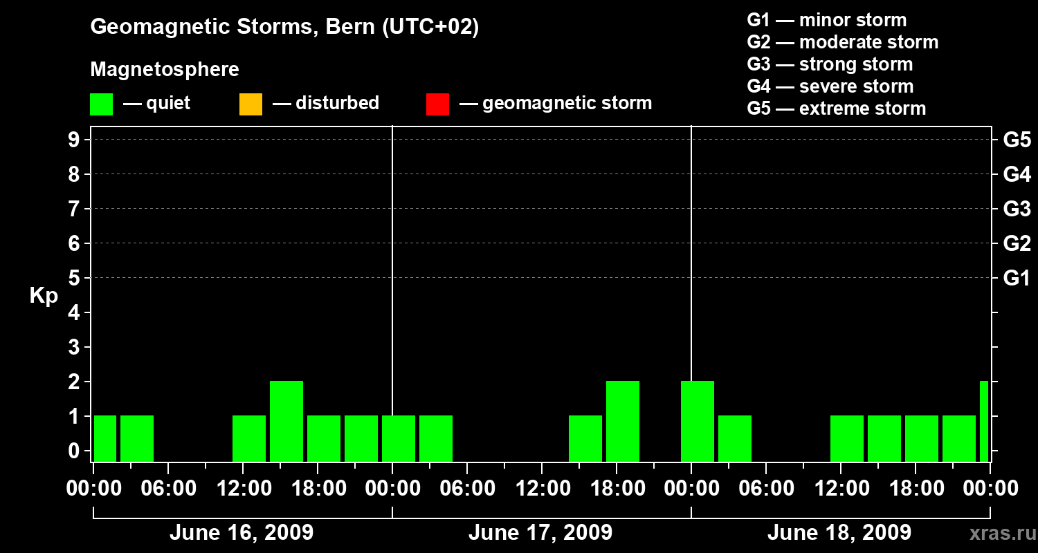 Changes in the geomagnetic index Kp from June 16 to 18, 2009 for mid latitudes