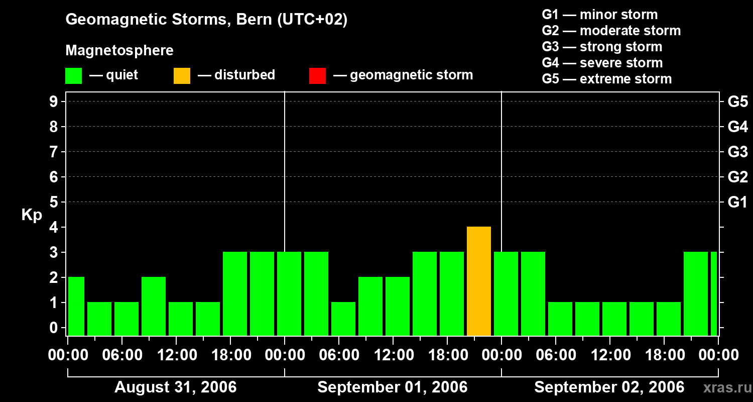 Changes in the geomagnetic index Kp from August 31 to September 2, 2006 for mid latitudes