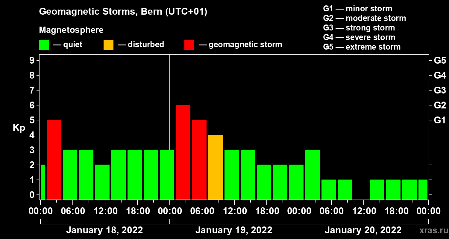Changes in the geomagnetic index Kp from January 18 to 20, 2022 for mid latitudes