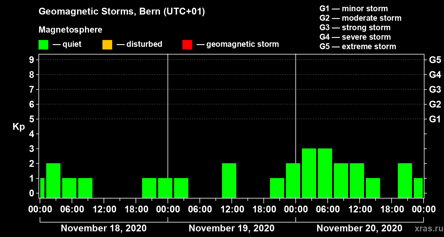 Changes in the geomagnetic index Kp from November 18 to 20, 2020 for mid latitudes