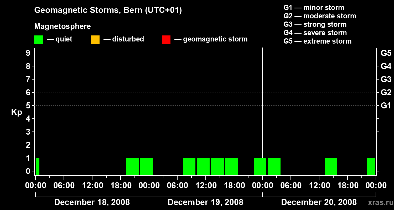 Changes in the geomagnetic index Kp from December 18 to 20, 2008 for mid latitudes