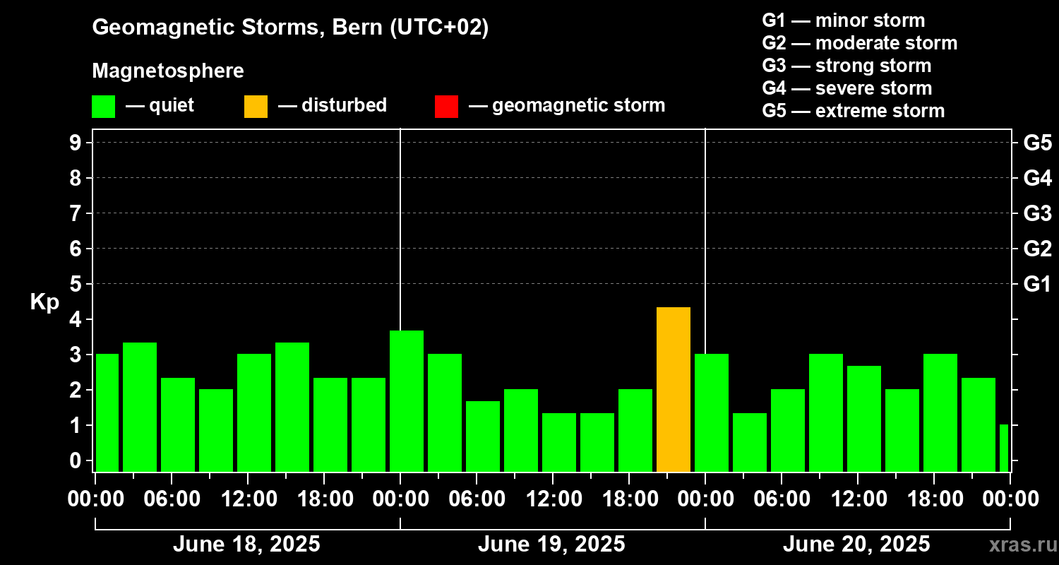 Changes in the geomagnetic index Kp from June 18 to 20, 2025 for mid latitudes