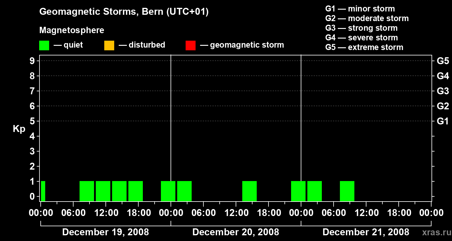 Changes in the geomagnetic index Kp from December 19 to 21, 2008 for mid latitudes