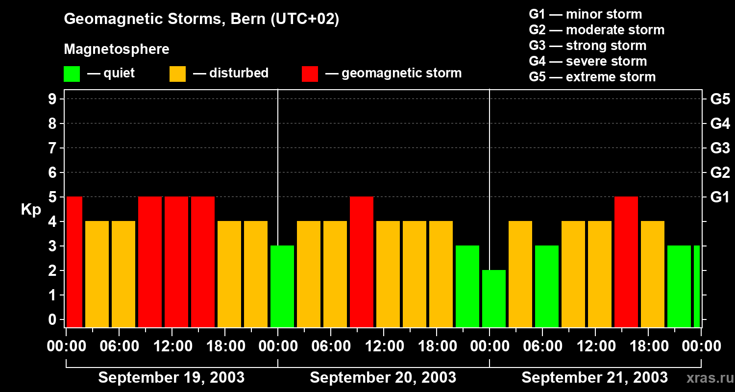 Changes in the geomagnetic index Kp from September 19 to 21, 2003 for mid latitudes
