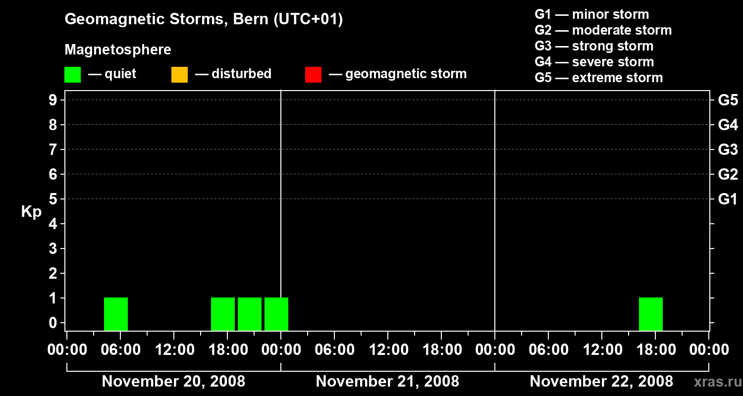 Changes in the geomagnetic index Kp from November 20 to 22, 2008 for mid latitudes