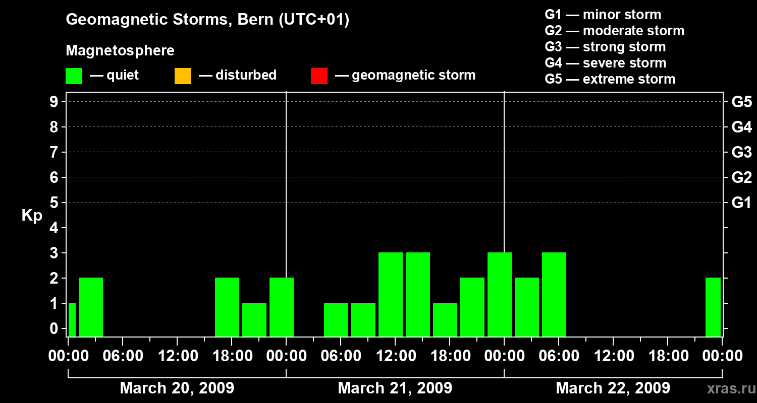Changes in the geomagnetic index Kp from March 20 to 22, 2009 for mid latitudes