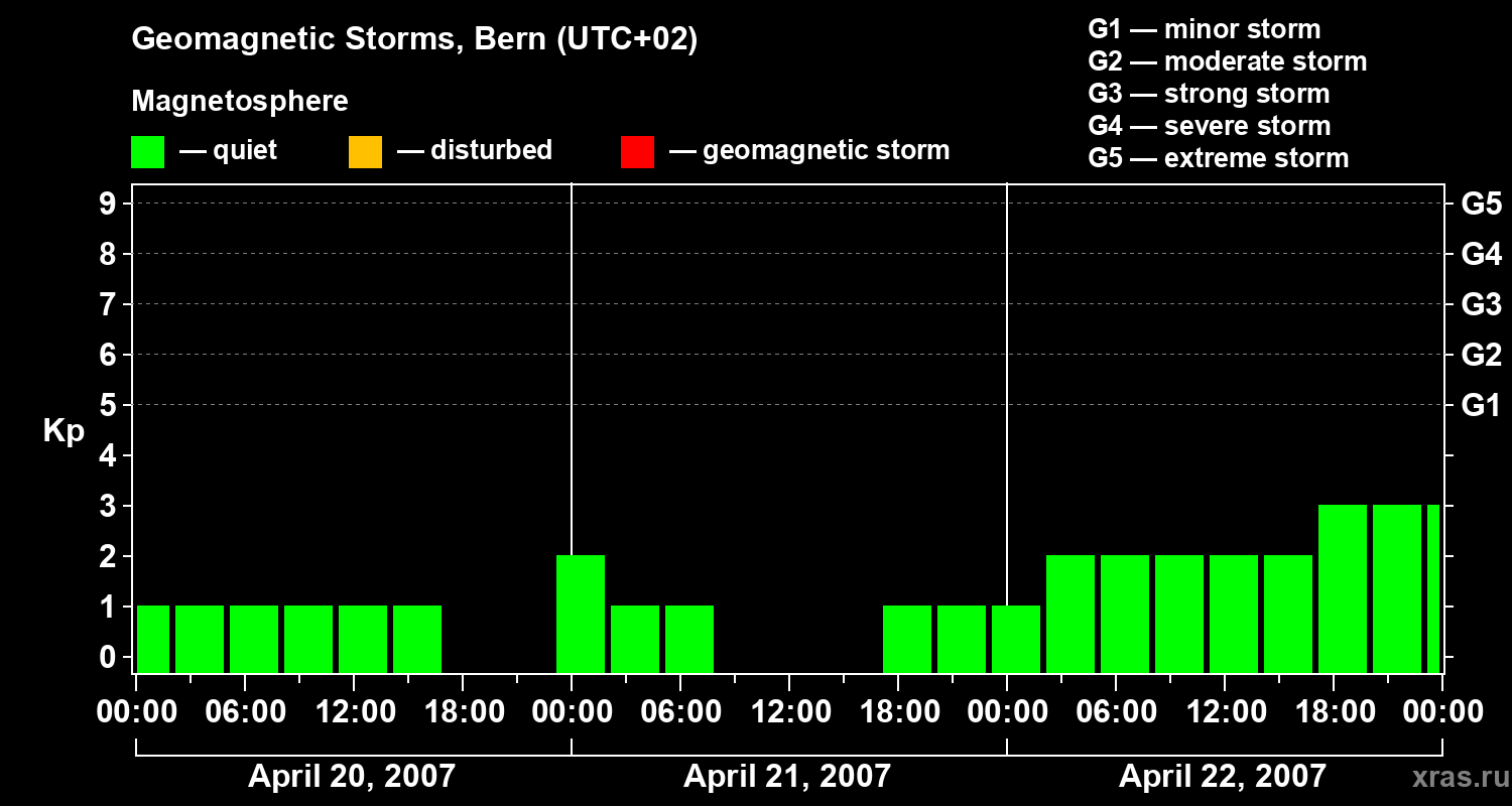 Changes in the geomagnetic index Kp from April 20 to 22, 2007 for mid latitudes