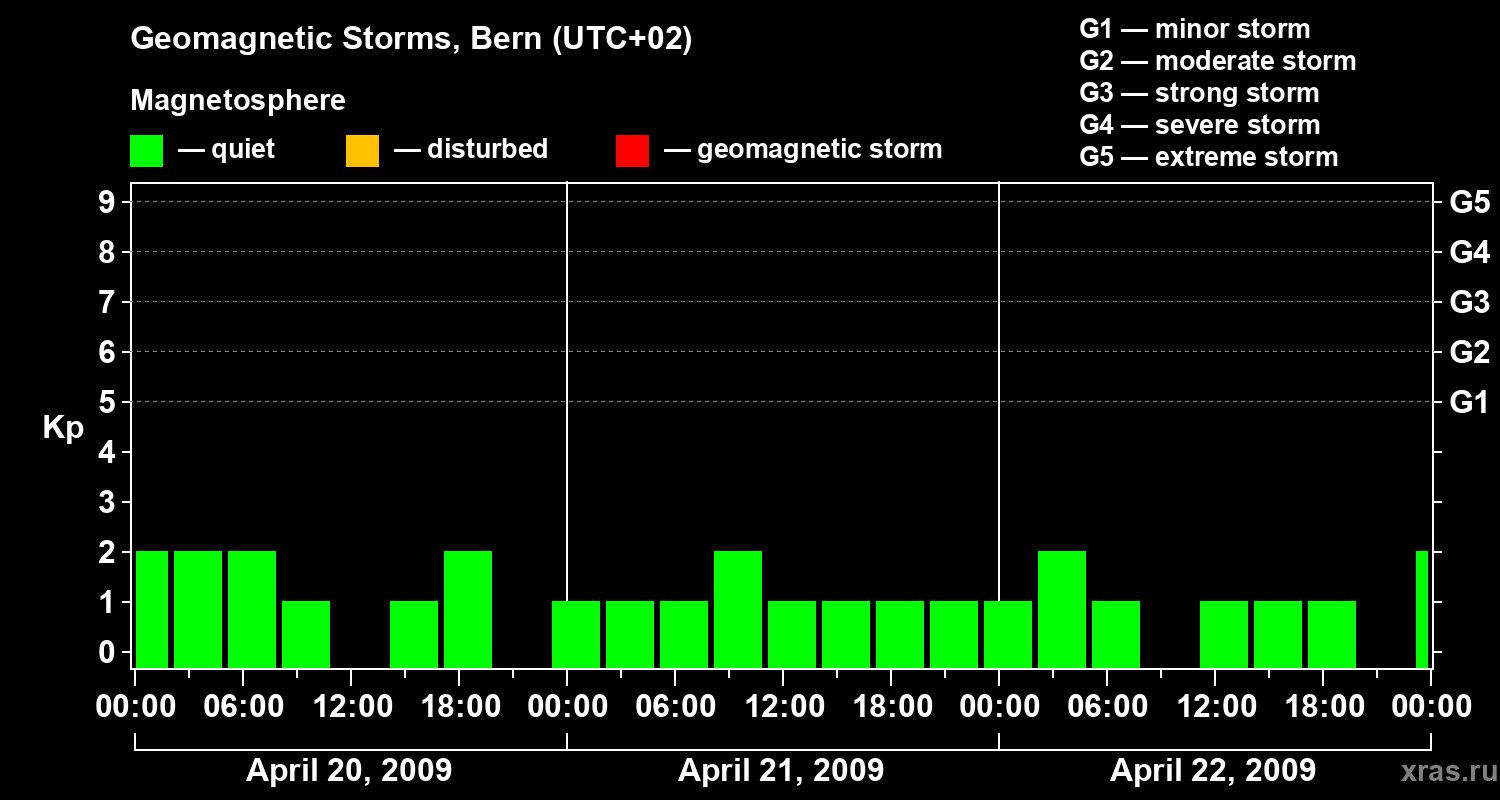 Changes in the geomagnetic index Kp from April 20 to 22, 2009 for mid latitudes