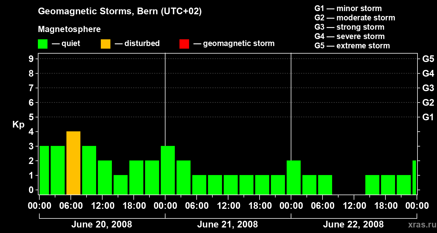 Changes in the geomagnetic index Kp from June 20 to 22, 2008 for mid latitudes
