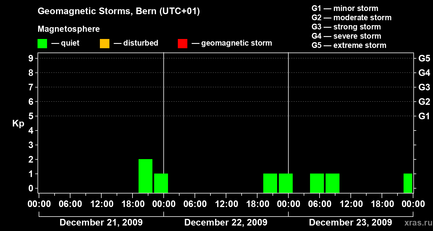 Changes in the geomagnetic index Kp from December 21 to 23, 2009 for mid latitudes