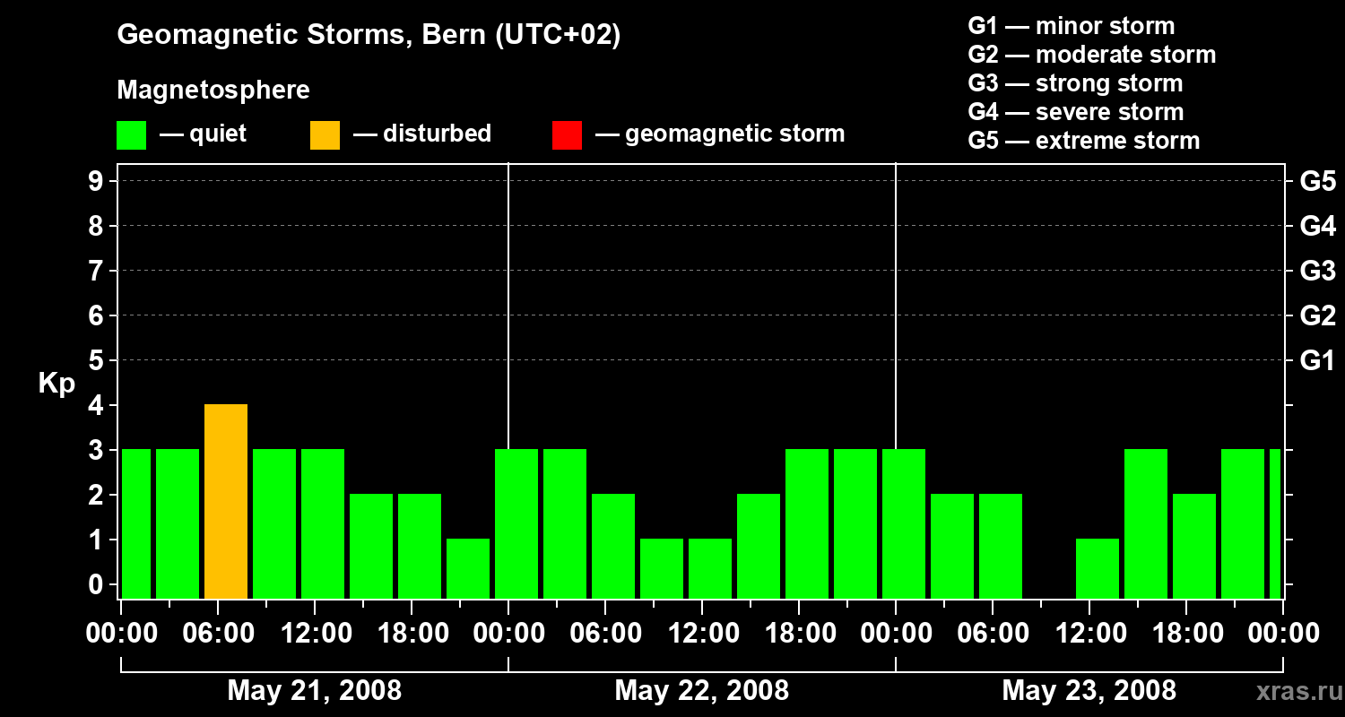 Changes in the geomagnetic index Kp from May 21 to 23, 2008 for mid latitudes