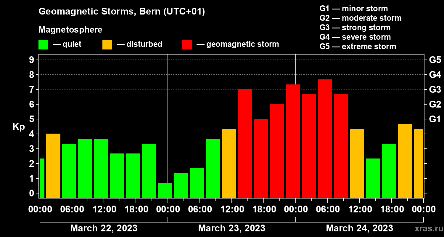 Changes in the geomagnetic index Kp from March 22 to 24, 2023 for mid latitudes