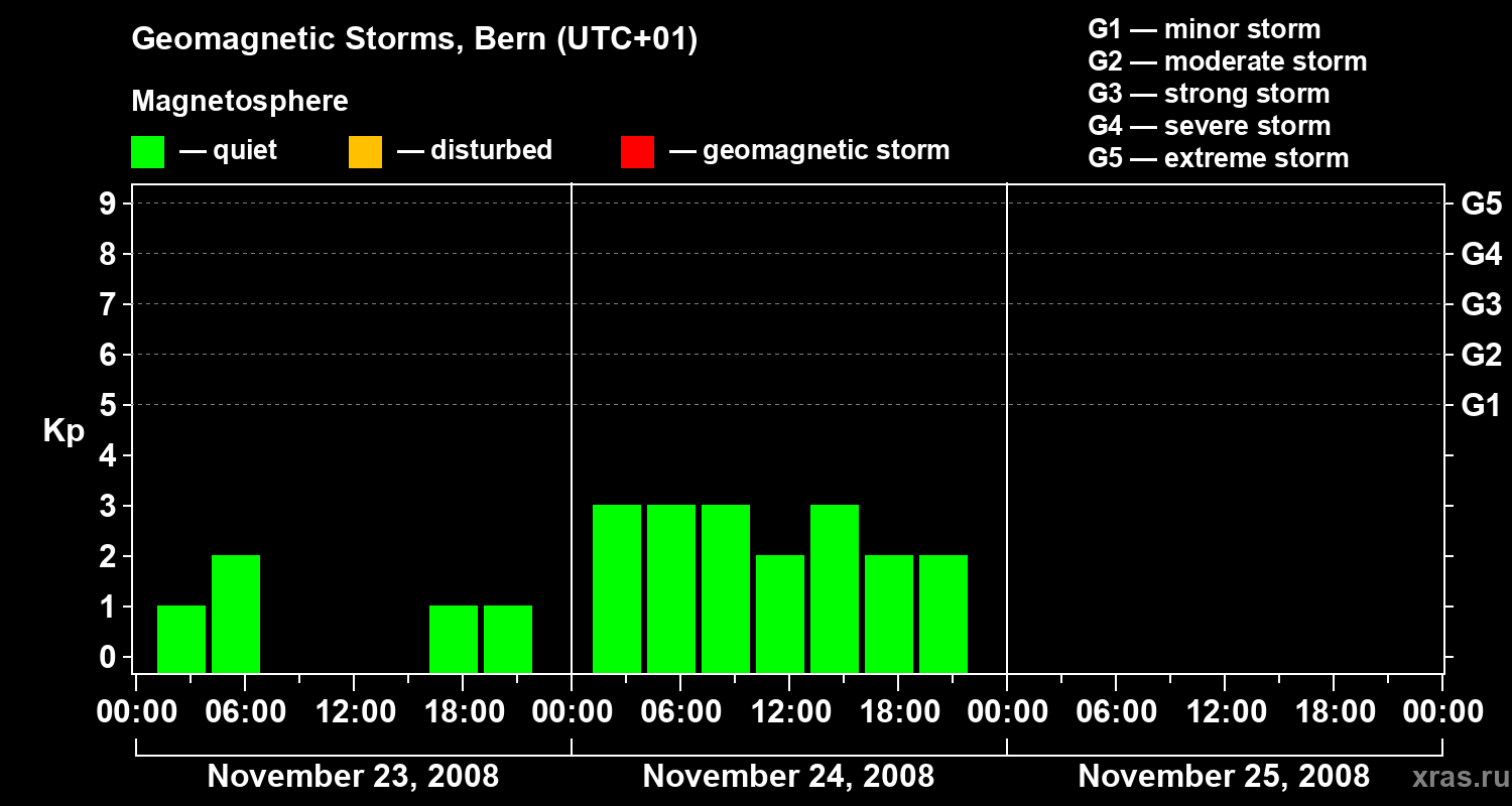 Changes in the geomagnetic index Kp from November 23 to 25, 2008 for mid latitudes