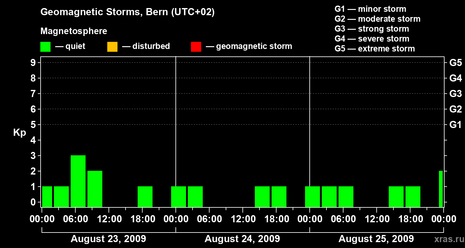Changes in the geomagnetic index Kp from August 23 to 25, 2009 for mid latitudes