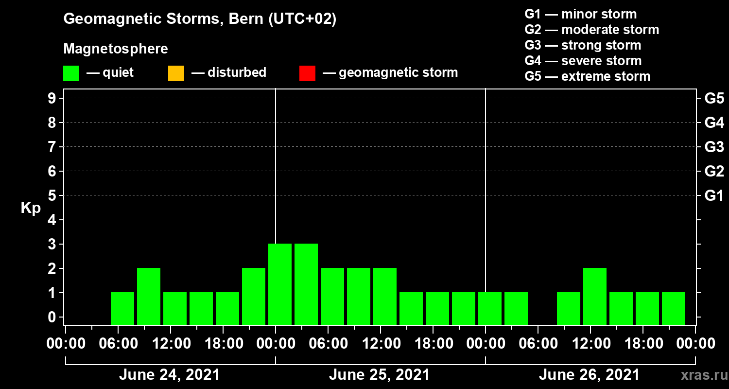 Changes in the geomagnetic index Kp from June 24 to 26, 2021 for mid latitudes