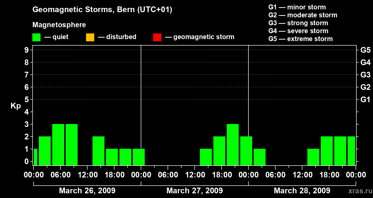 Changes in the geomagnetic index Kp from March 26 to 28, 2009 for mid latitudes