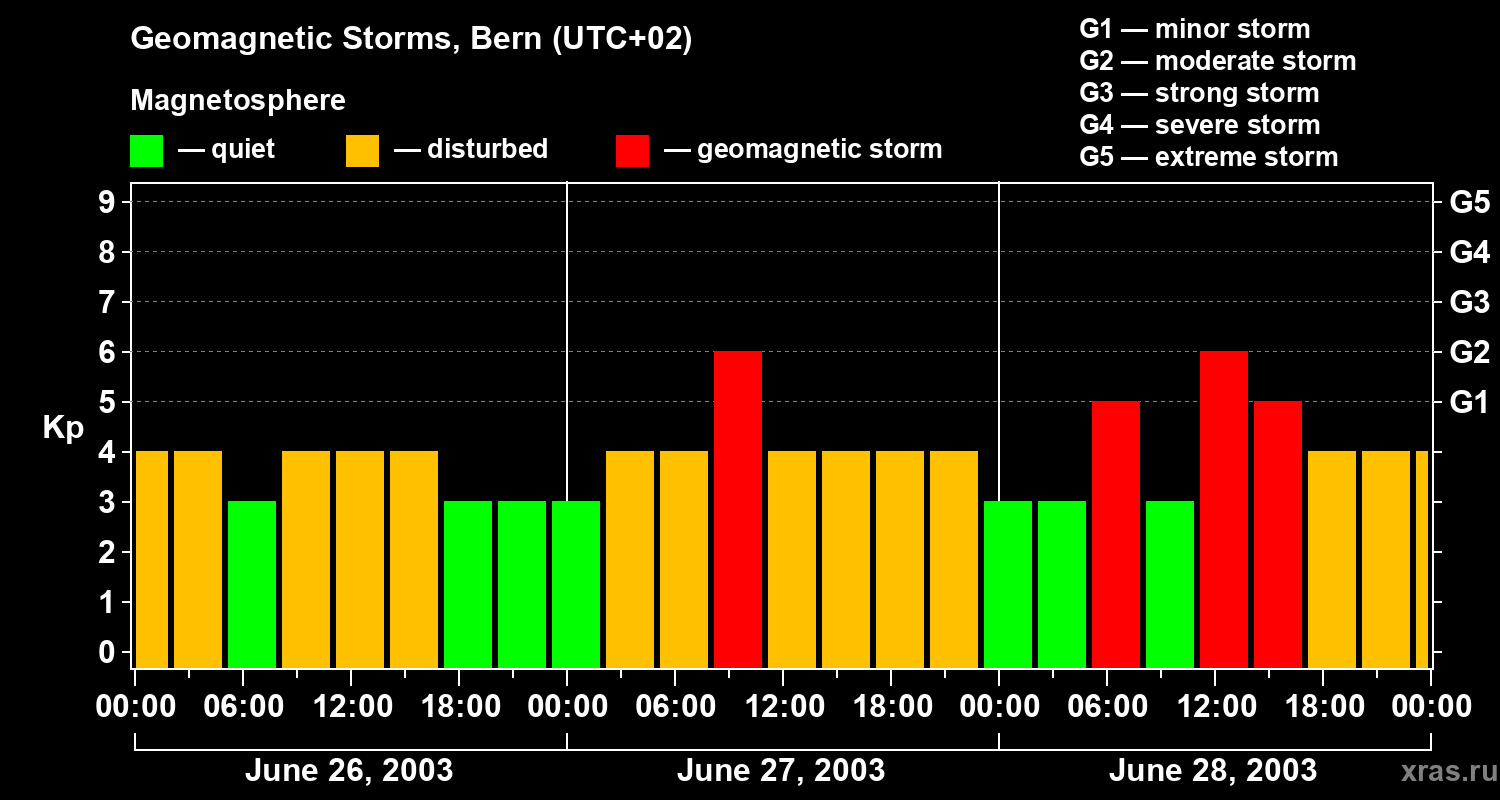 Changes in the geomagnetic index Kp from June 26 to 28, 2003 for mid latitudes