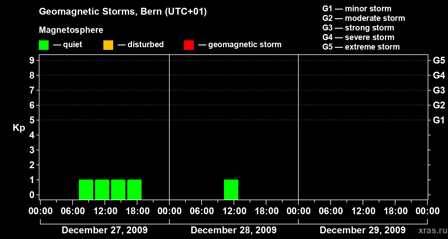 Changes in the geomagnetic index Kp from December 27 to 29, 2009 for mid latitudes