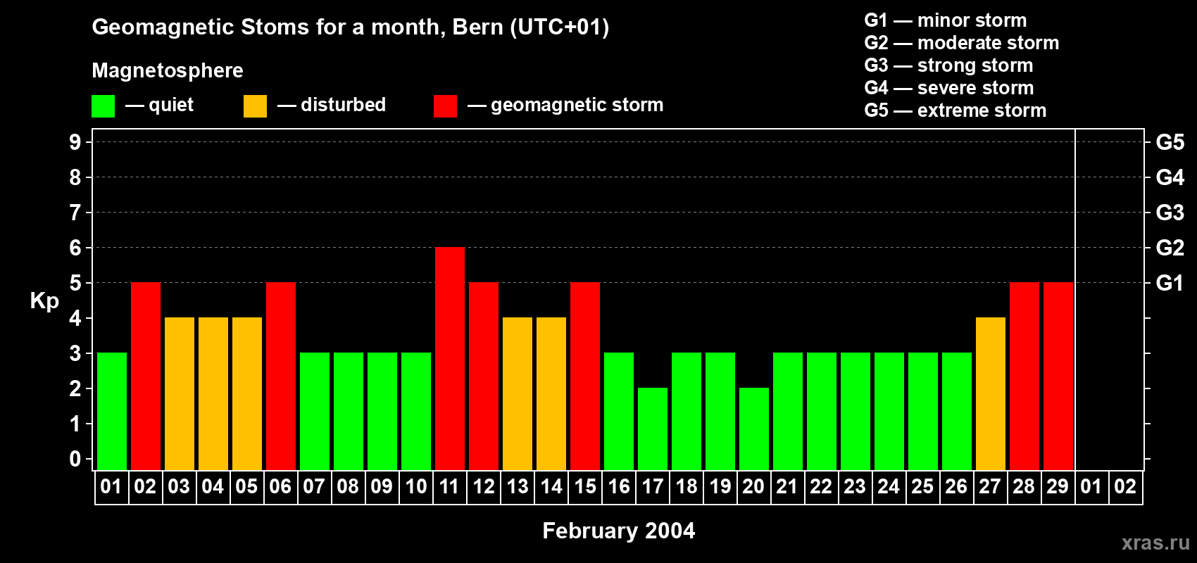 Changes in the maximum daily geomagnetic index Kp in February 2004 for mid latitudes