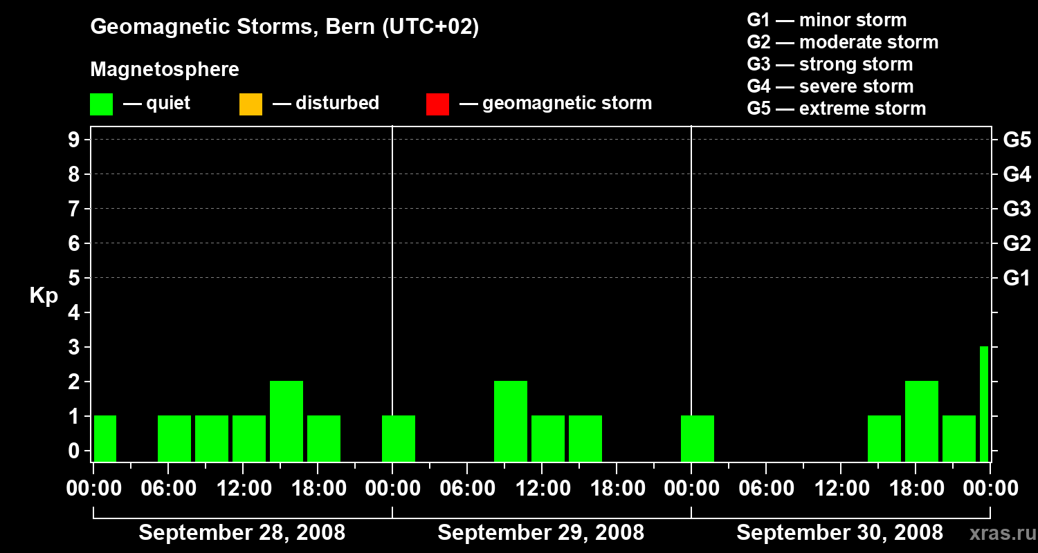 Changes in the geomagnetic index Kp from September 28 to 30, 2008 for mid latitudes