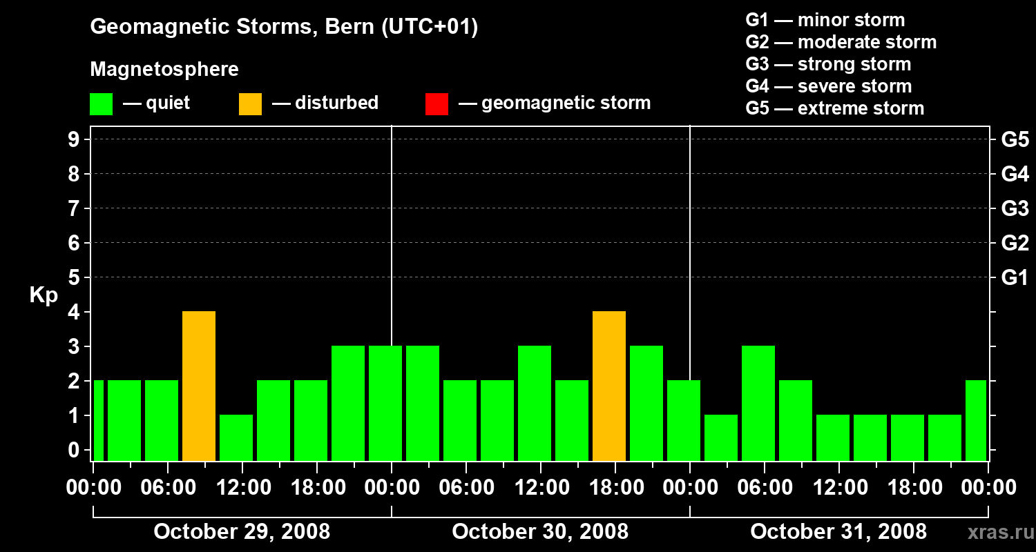 Changes in the geomagnetic index Kp from October 29 to 31, 2008 for mid latitudes