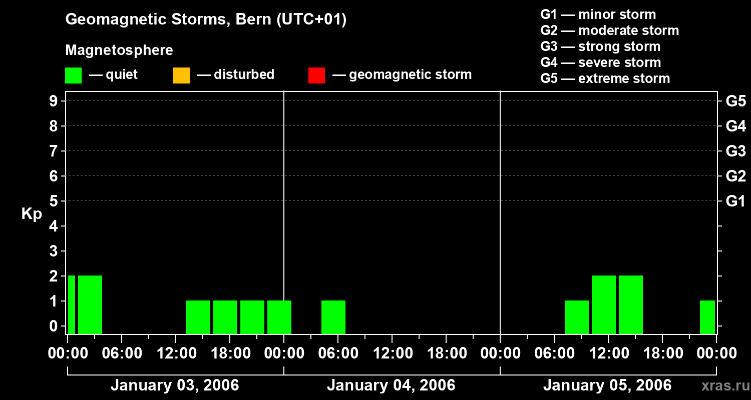 Changes in the geomagnetic index Kp from January 3 to 5, 2006 for mid latitudes