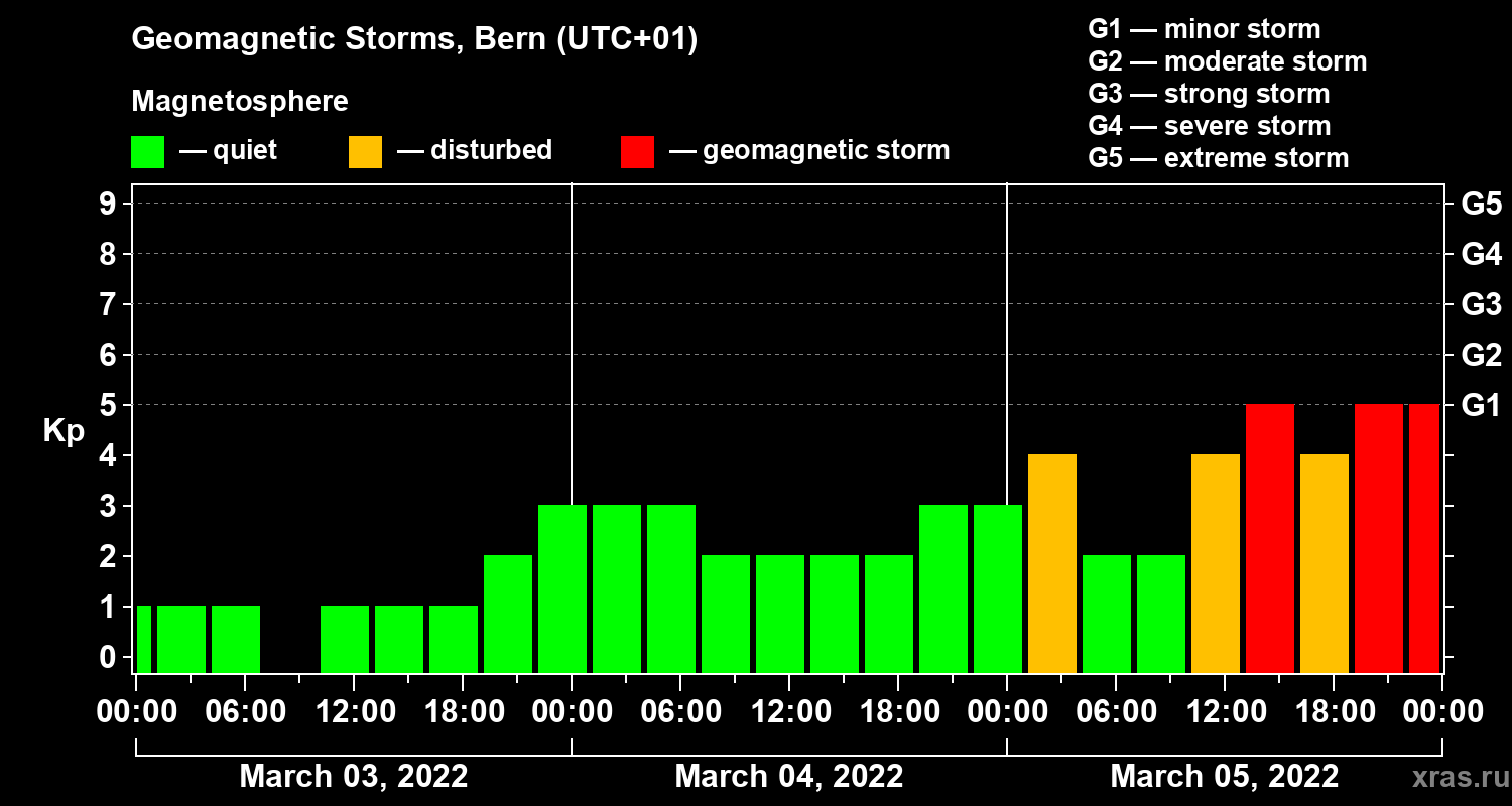 Changes in the geomagnetic index Kp from March 3 to 5, 2022 for mid latitudes