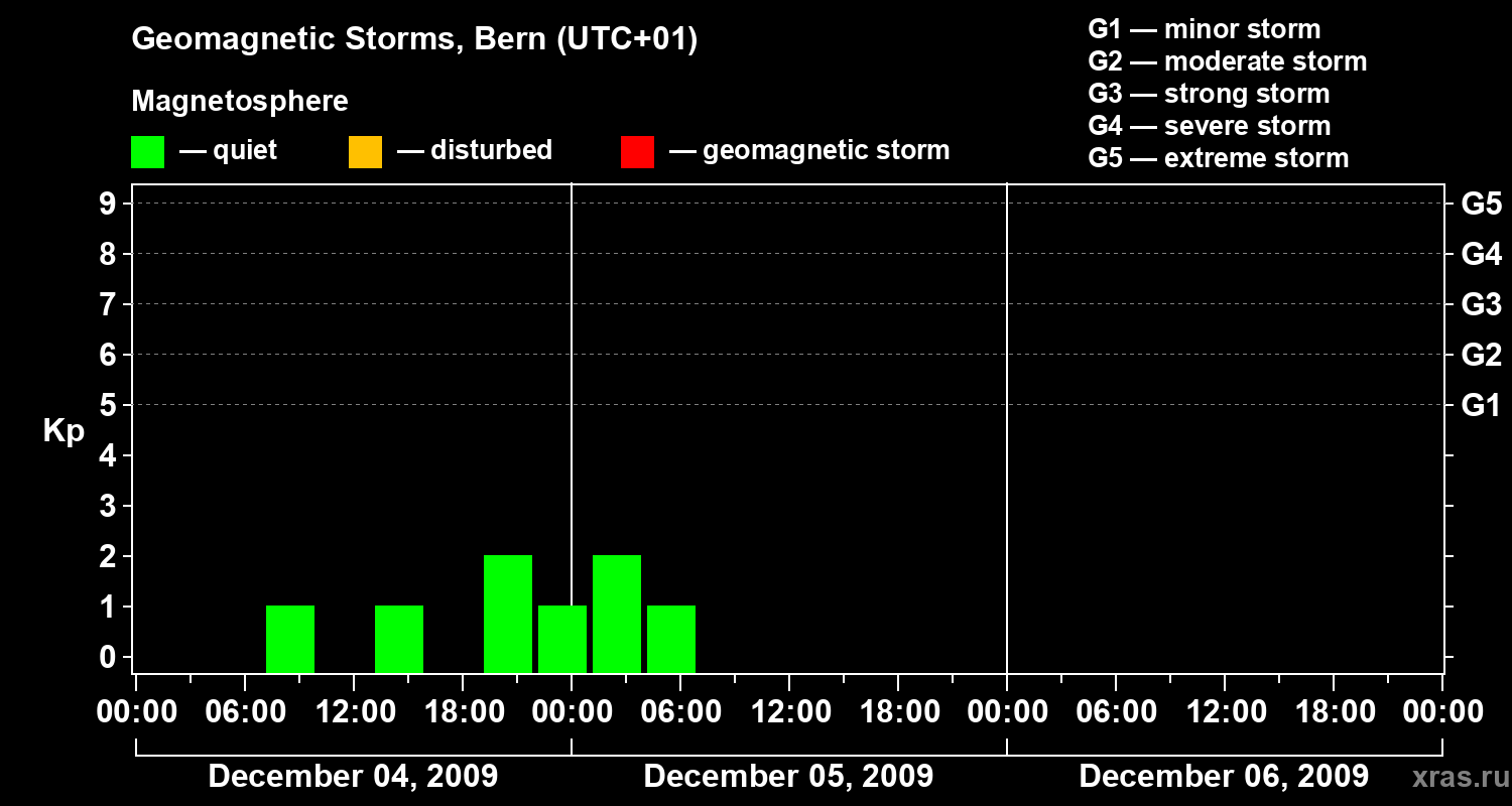 Changes in the geomagnetic index Kp from December 4 to 6, 2009 for mid latitudes