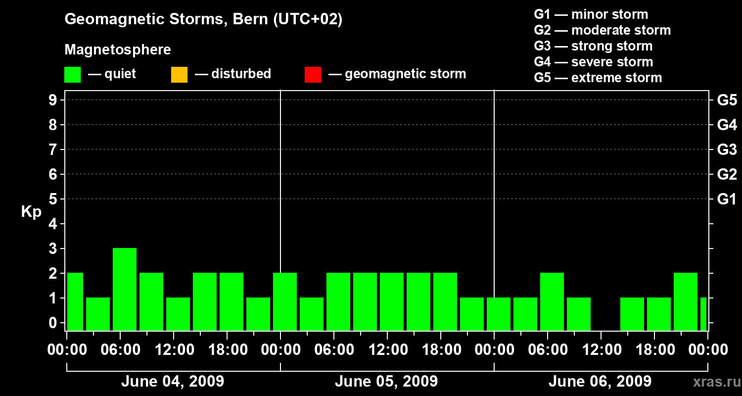 Changes in the geomagnetic index Kp from June 4 to 6, 2009 for mid latitudes