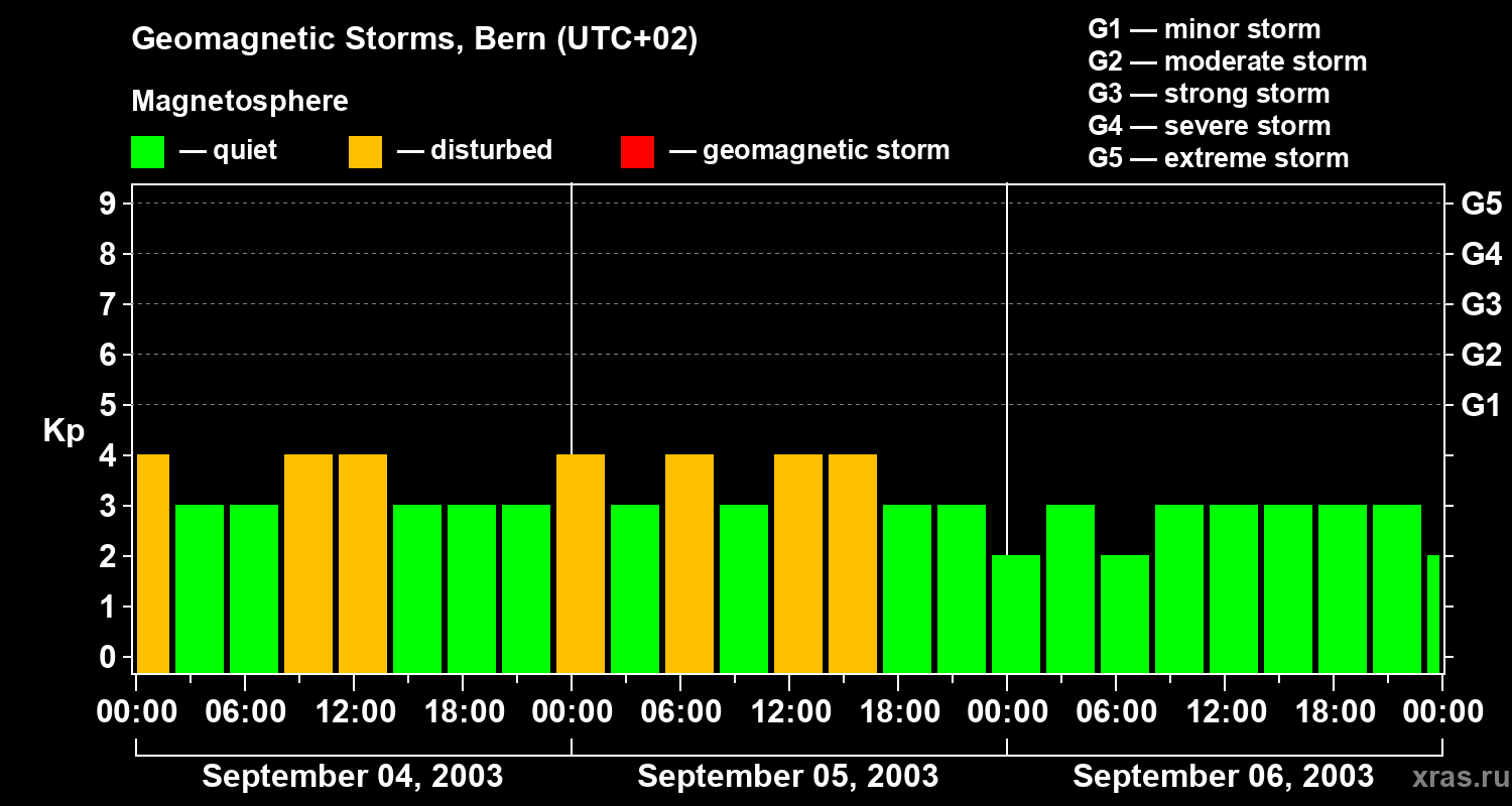 Changes in the geomagnetic index Kp from September 4 to 6, 2003 for mid latitudes