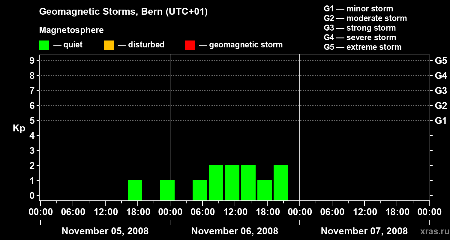 Changes in the geomagnetic index Kp from November 5 to 7, 2008 for mid latitudes