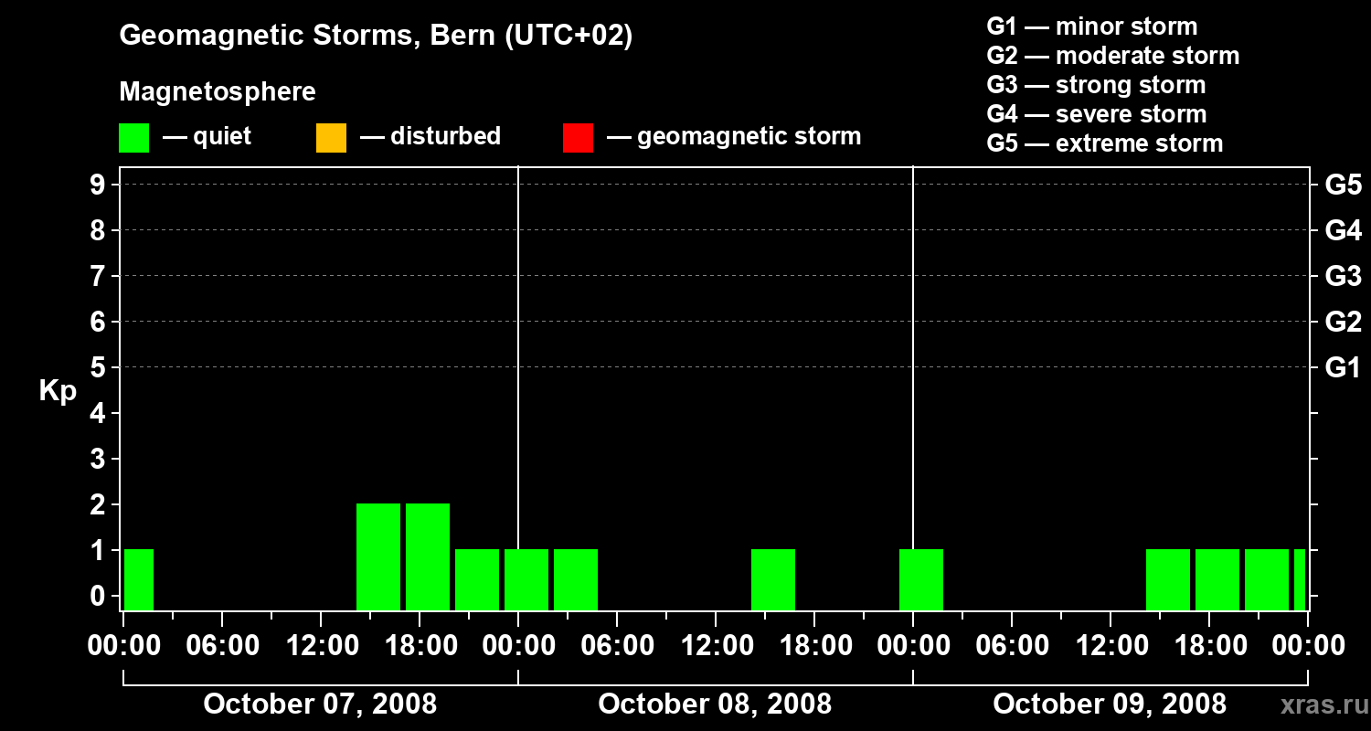 Changes in the geomagnetic index Kp from October 7 to 9, 2008 for mid latitudes