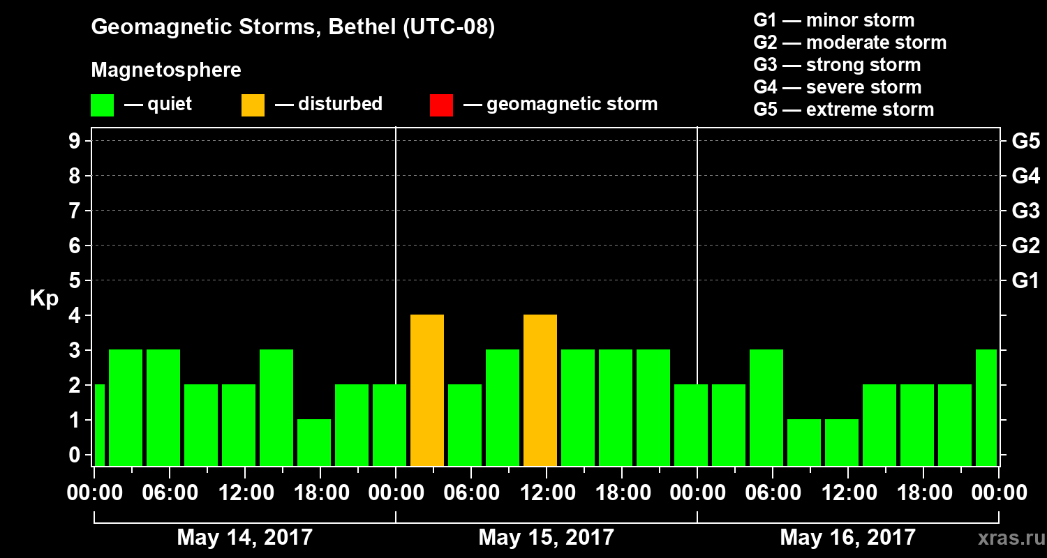 Changes in the geomagnetic index Kp from May 14 to 16, 2017 for mid latitudes