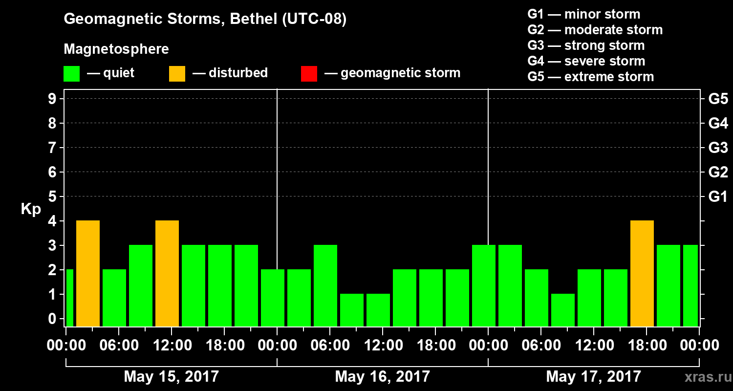 Changes in the geomagnetic index Kp from May 15 to 17, 2017 for mid latitudes