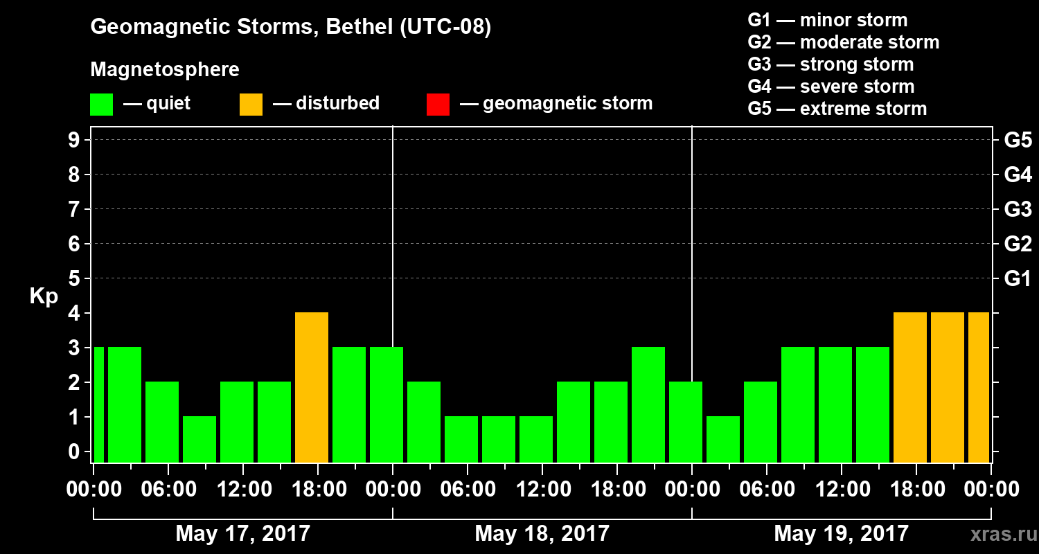Changes in the geomagnetic index Kp from May 17 to 19, 2017 for mid latitudes
