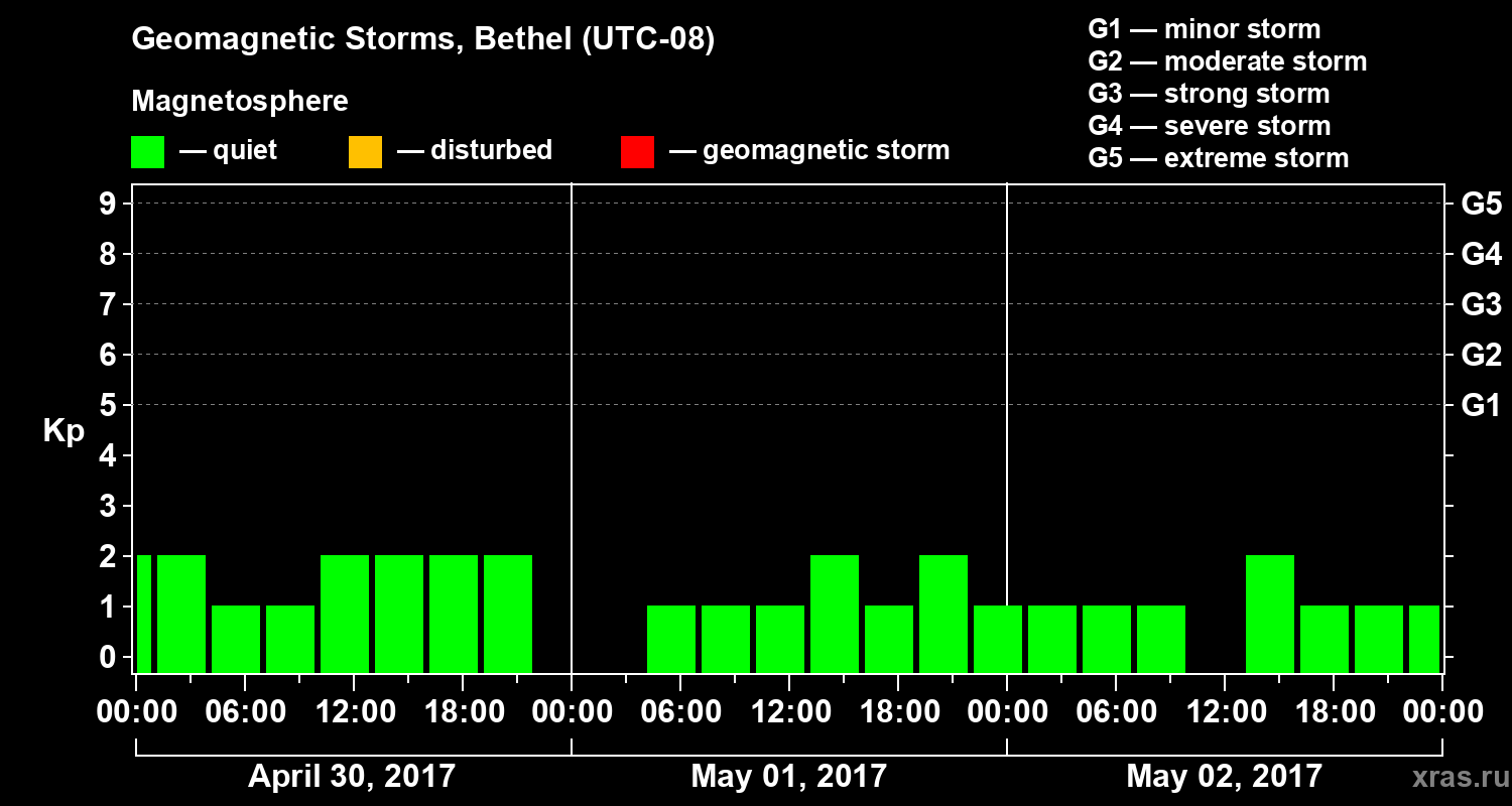 Changes in the geomagnetic index Kp from April 30 to May 2, 2017 for mid latitudes