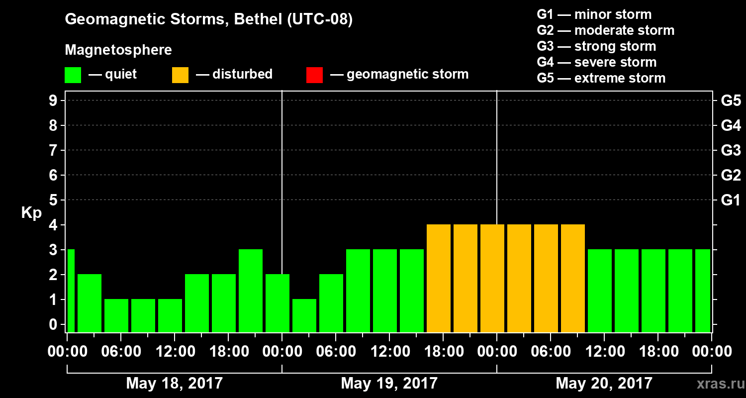 Changes in the geomagnetic index Kp from May 18 to 20, 2017 for mid latitudes