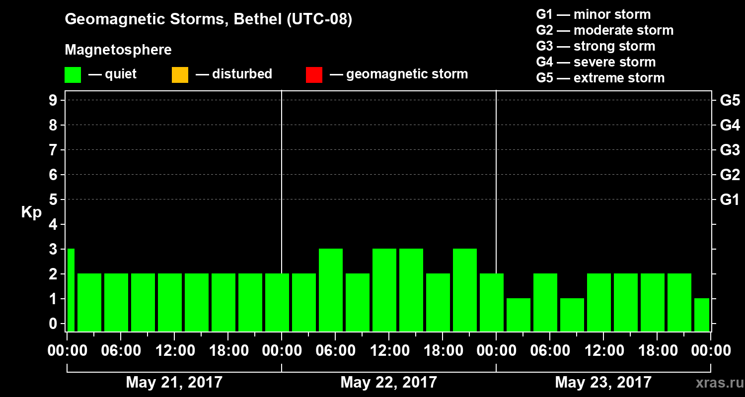 Changes in the geomagnetic index Kp from May 21 to 23, 2017 for mid latitudes