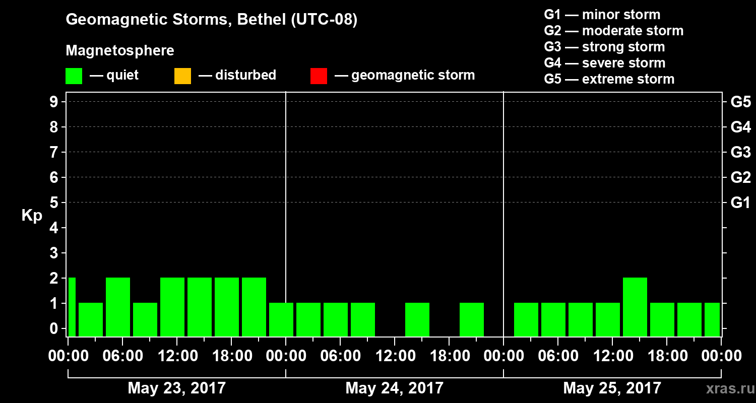 Changes in the geomagnetic index Kp from May 23 to 25, 2017 for mid latitudes