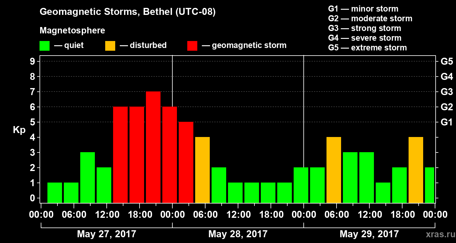 Changes in the geomagnetic index Kp from May 27 to 29, 2017 for mid latitudes