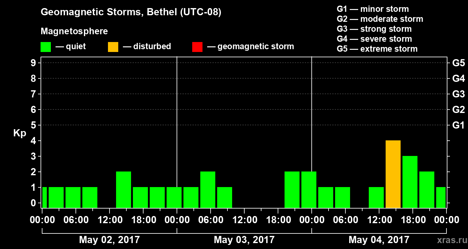 Changes in the geomagnetic index Kp from May 2 to 4, 2017 for mid latitudes