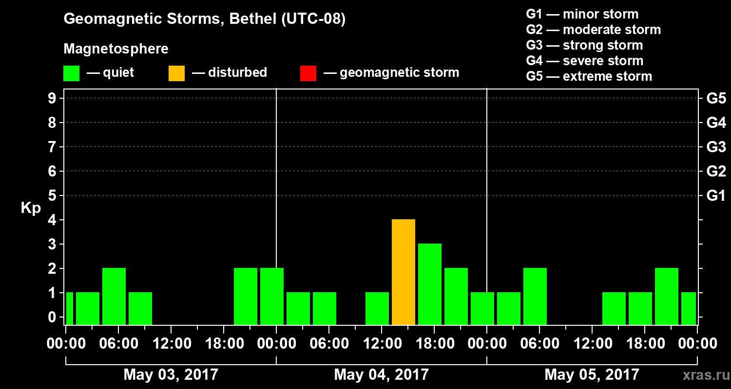 Changes in the geomagnetic index Kp from May 3 to 5, 2017 for mid latitudes