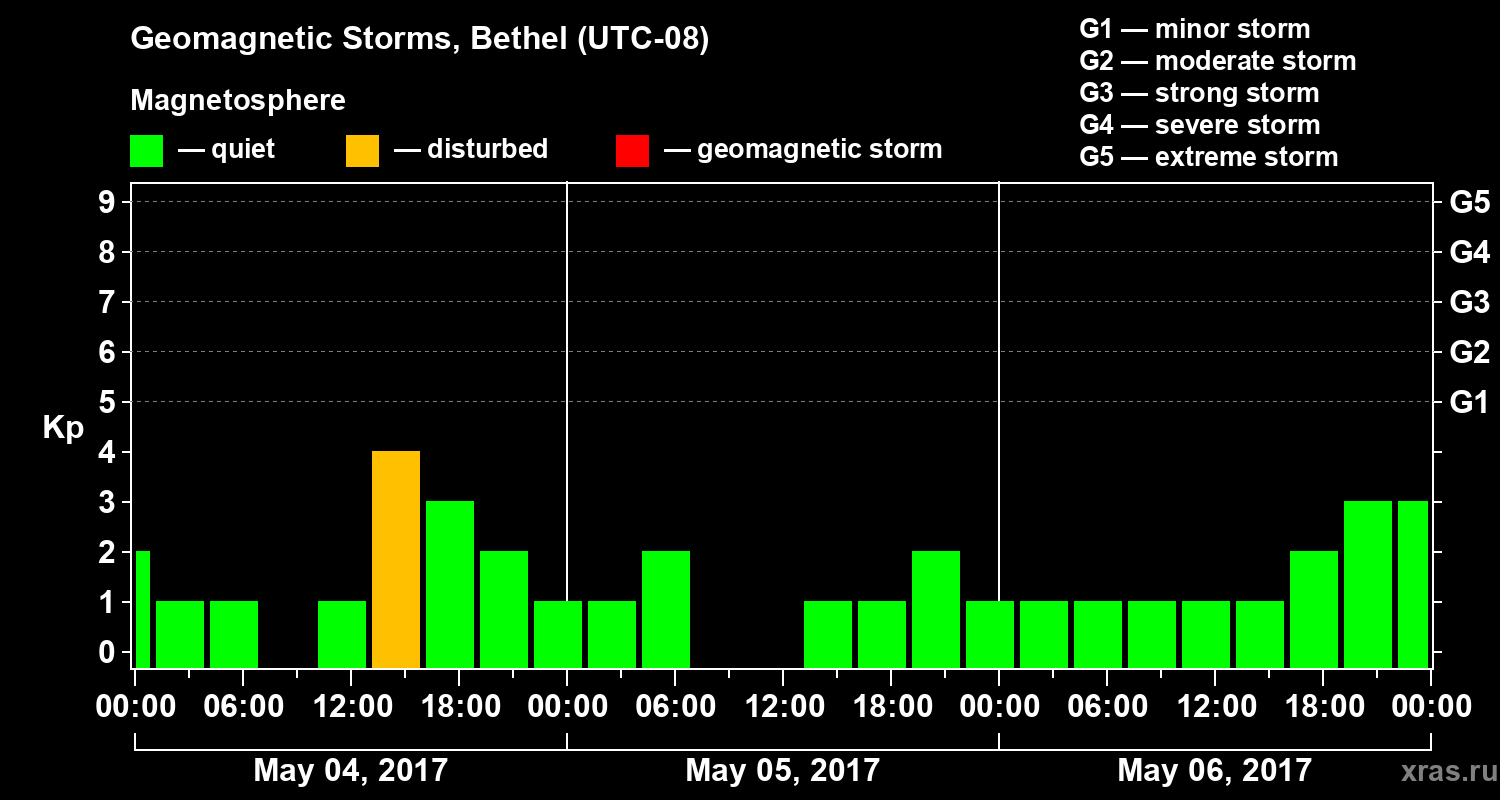Changes in the geomagnetic index Kp from May 4 to 6, 2017 for mid latitudes
