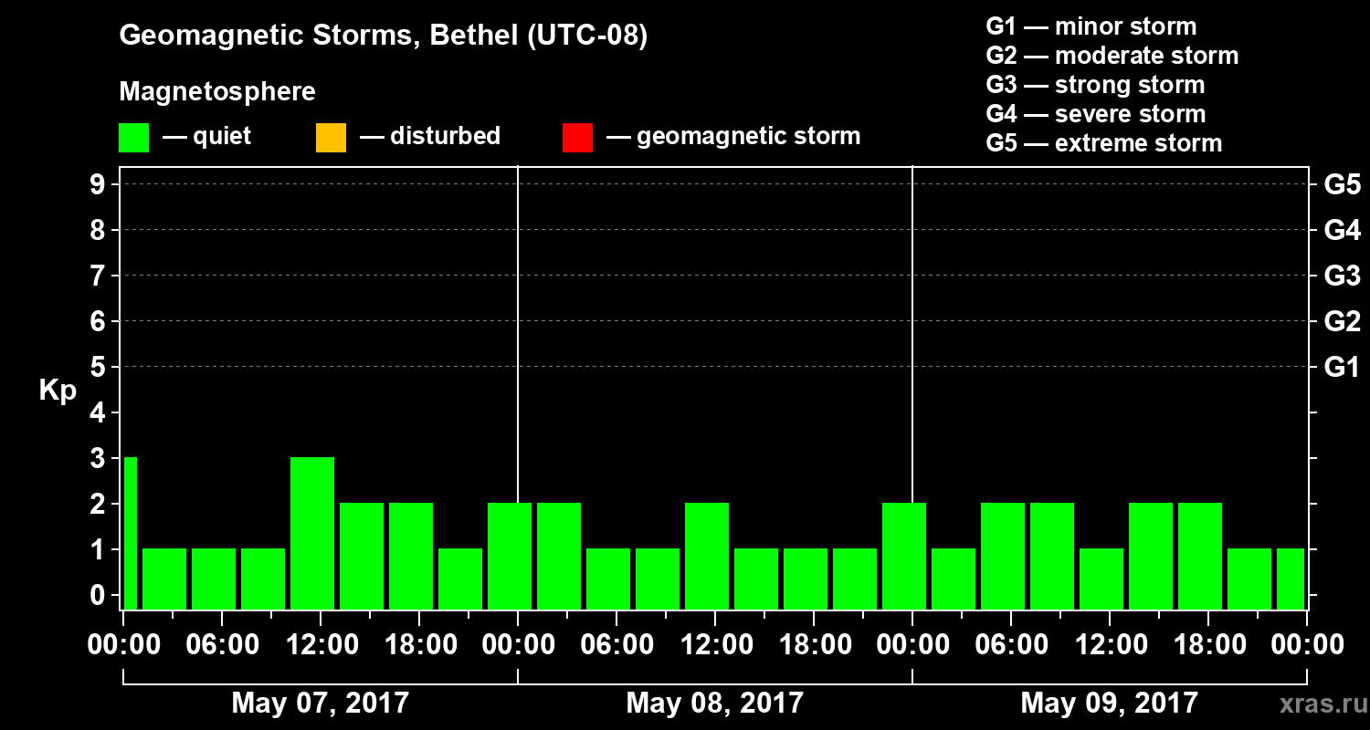 Changes in the geomagnetic index Kp from May 7 to 9, 2017 for mid latitudes
