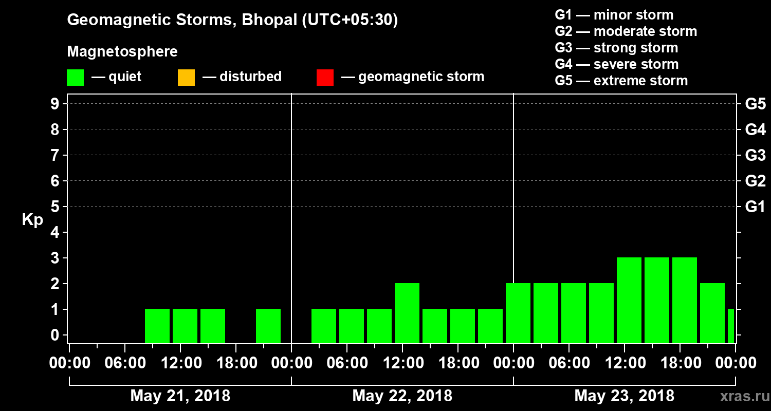Changes in the geomagnetic index Kp from May 21 to 23, 2018 for mid latitudes
