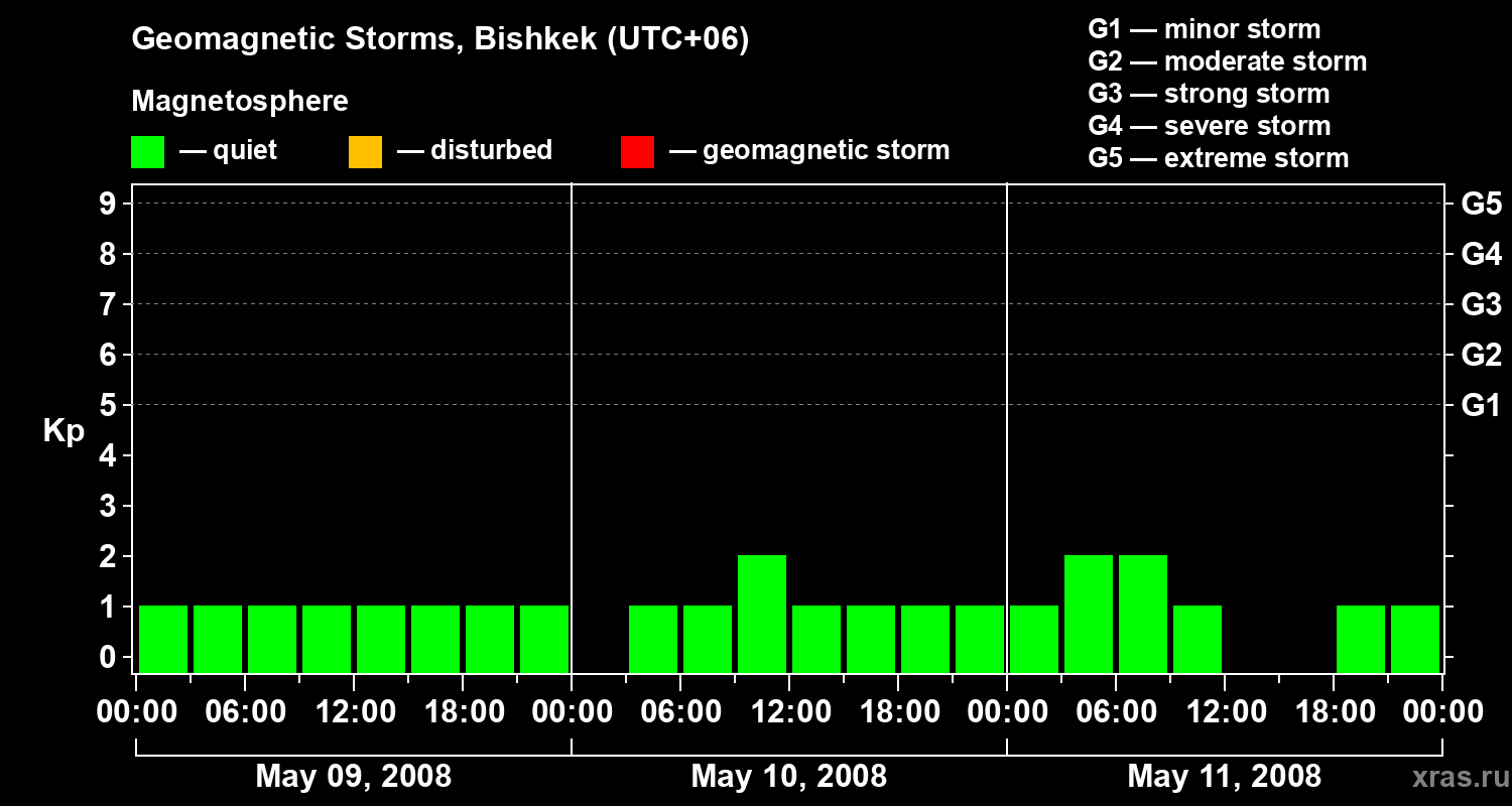 Changes in the geomagnetic index Kp from May 9 to 11, 2008 for mid latitudes