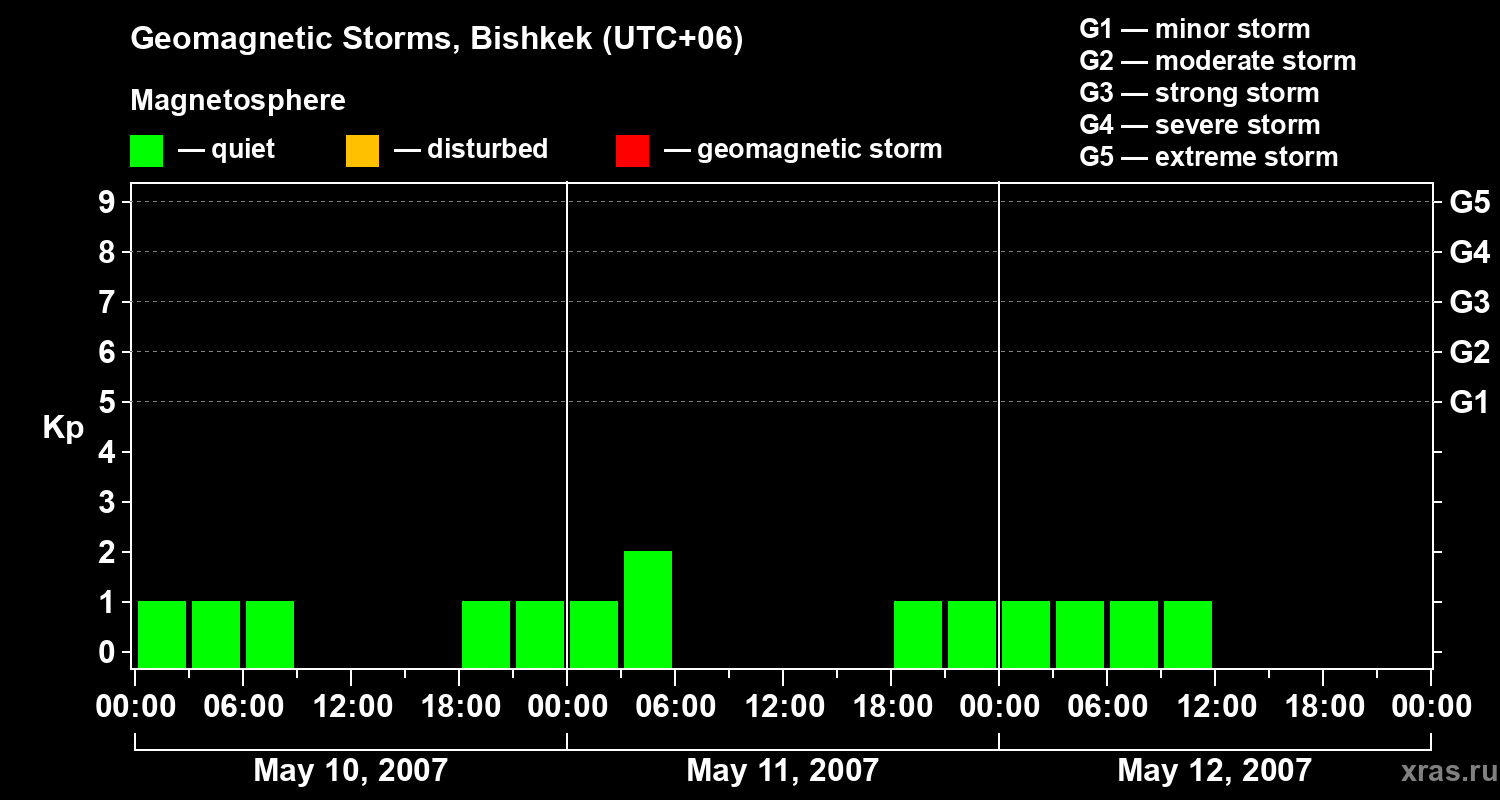 Changes in the geomagnetic index Kp from May 10 to 12, 2007 for mid latitudes