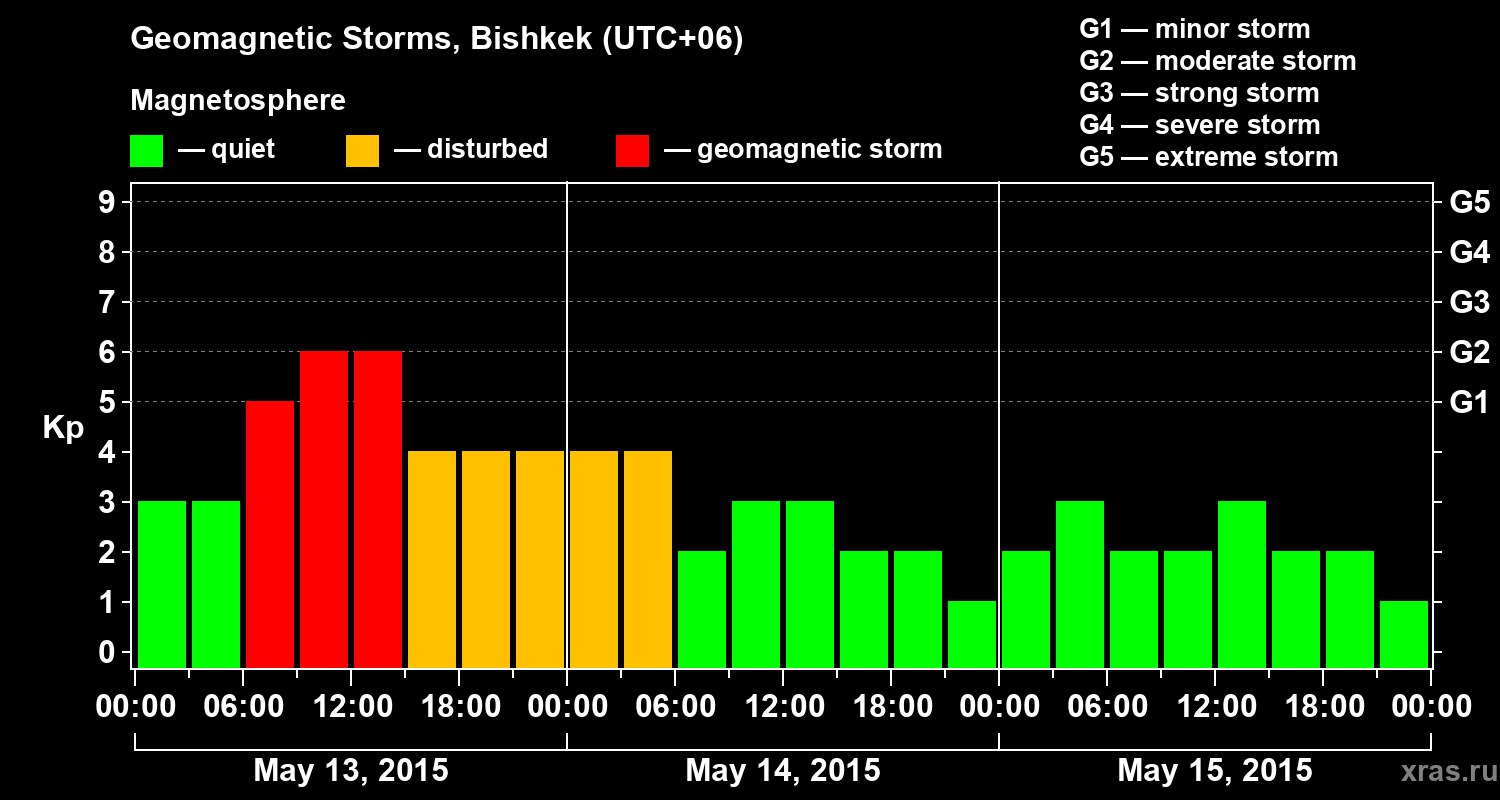 Changes in the geomagnetic index Kp from May 13 to 15, 2015 for mid latitudes